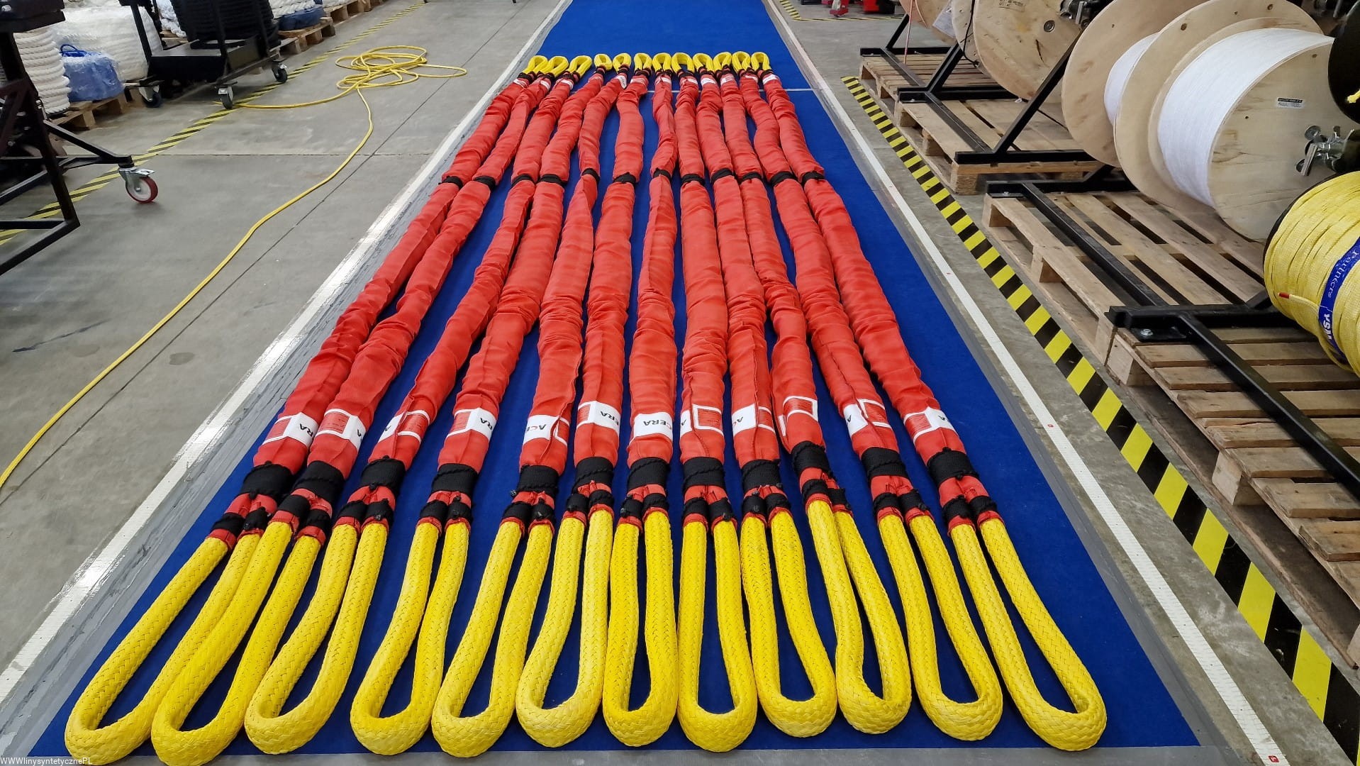 Zawiesie z liny HMPE w osłonie z węża PES, konstrukcja o obwodzie zamkniętym z przewiązanymi okami. Oka w osłonie HMPE.